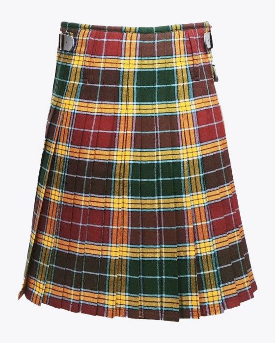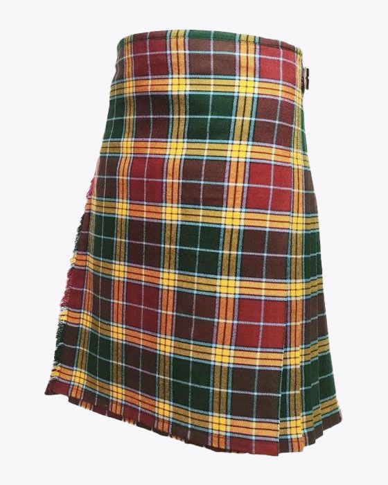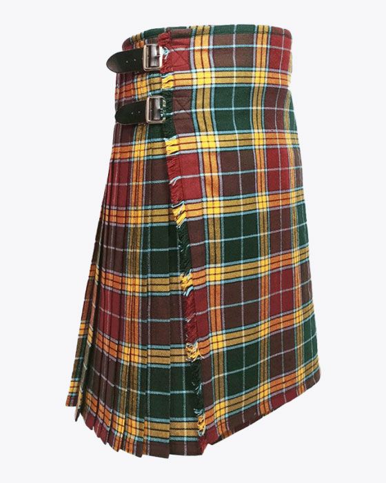 Each tartan kilt has 3 buckles and straps for size adjustment: genuine leather waist straps (4" long by 1 1/4" wide). Kilt straps on this kilt are set with an allowance of 2" looser. This kilt's front edge has fringe and is pleated to the sett but can be pleated to stripe by request. There are two belt loops at the back. The kilt has a 100% cotton lining for a soft feel when being worn. The standard kilt comes with a 5-yard, but you can convert it into an 8-yard by selecting the "8-yard kilt" option.
