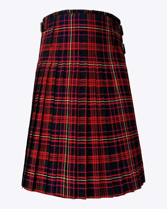 Each tartan kilt has 3 buckles and straps for size adjustment: genuine leather waist straps (4" long by 1 1/4" wide). Kilt straps on this kilt are set with an allowance of 2" looser. This kilt's front edge has fringe and is pleated to the sett but can be pleated to stripe by request. There are two belt loops at the back. The kilt has a 100% cotton lining for a soft feel when being worn. The standard kilt comes with a 5-yard, but you can convert it into an 8-yard by selecting the "8-yard kilt" option.