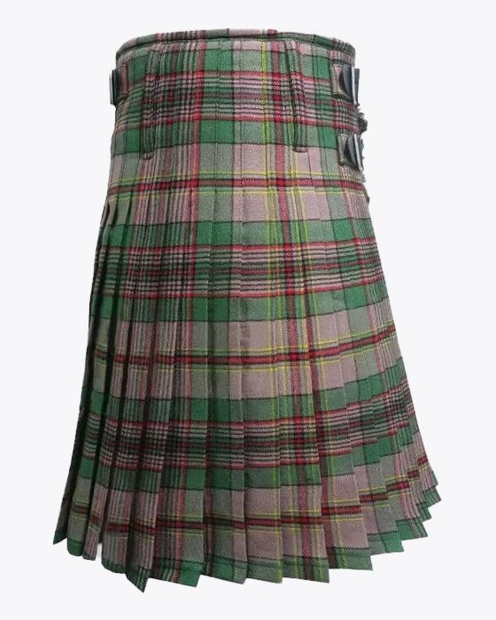 Each tartan kilt has 3 buckles and straps for size adjustment: genuine leather waist straps (4" long by 1 1/4" wide). Kilt straps on this kilt are set with an allowance of 2" looser. This kilt's front edge has fringe and is pleated to the sett but can be pleated to stripe by request. There are two belt loops at the back. The kilt has a 100% cotton lining for a soft feel when being worn. The standard kilt comes with a 5-yard, but you can convert it into an 8-yard by selecting the "8-yard kilt" option.