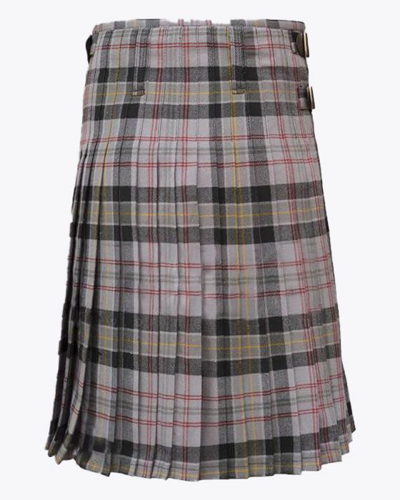 Each tartan kilt has 3 buckles and straps for size adjustment: genuine leather waist straps (4" long by 1 1/4" wide). Kilt straps on this kilt are set with an allowance of 2" looser. This kilt's front edge has fringe and is pleated to the sett but can be pleated to stripe by request. There are two belt loops at the back. The kilt has a 100% cotton lining for a soft feel when being worn. The standard kilt comes with a 5-yard, but you can convert it into an 8-yard by selecting the "8-yard kilt" option.