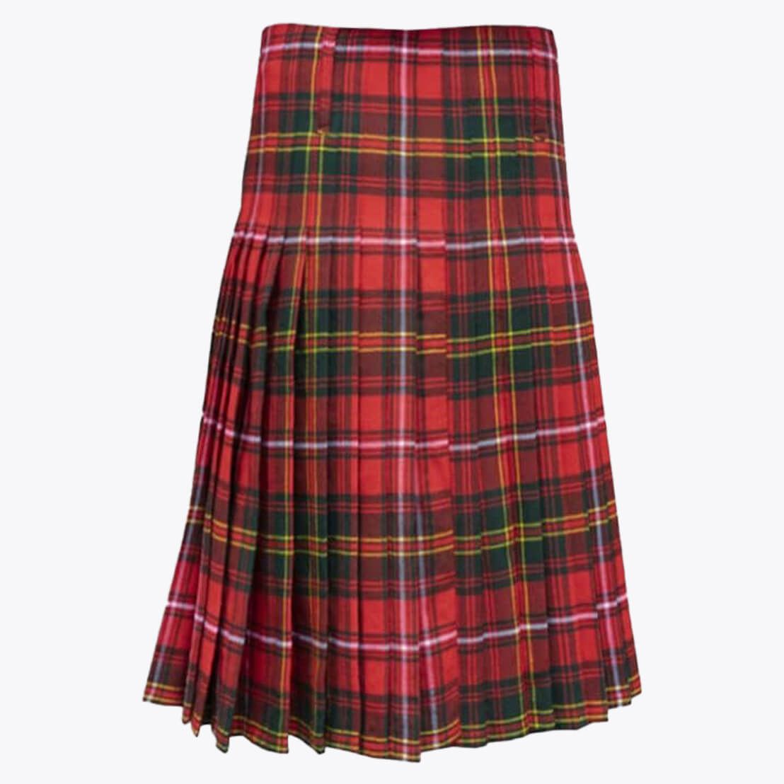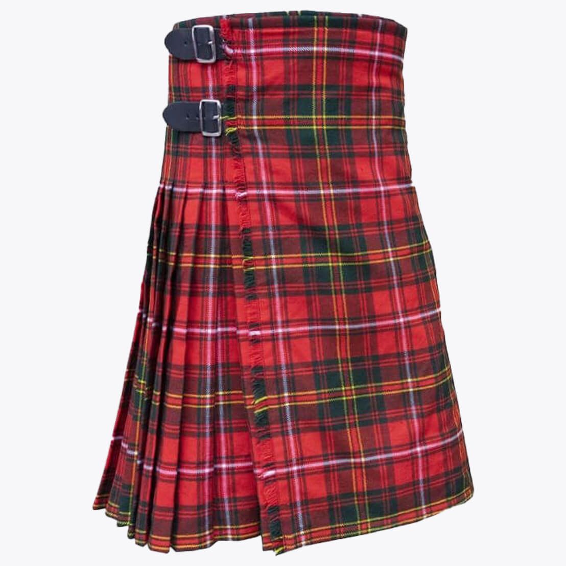 Each tartan kilt has 3 buckles and straps for size adjustment: genuine leather waist straps (4" long by 1 1/4" wide). Kilt straps on this kilt are set with an allowance of 2" looser. This kilt's front edge has fringe and is pleated to the sett but can be pleated to stripe by request. There are two belt loops at the back. The kilt has a 100% cotton lining for a soft feel when being worn. The standard kilt comes with a 5-yard, but you can convert it into an 8-yard by selecting the "8-yard kilt" option.