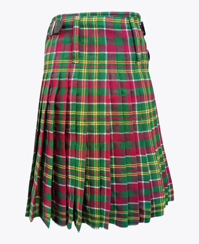 Each tartan kilt has 3 buckles and straps for size adjustment: genuine leather waist straps (4" long by 1 1/4" wide). Kilt straps on this kilt are set with an allowance of 2" looser. This kilt's front edge has fringe and is pleated to the sett but can be pleated to stripe by request. There are two belt loops at the back. The kilt has a 100% cotton lining for a soft feel when being worn. The standard kilt comes with a 5-yard, but you can convert it into an 8-yard by selecting the "8-yard kilt" option.