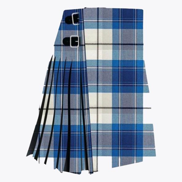 Each tartan kilt has 3 buckles and straps for size adjustment: genuine leather waist straps (4" long by 1 1/4" wide). Kilt straps on this kilt are set with an allowance of 2" looser. This kilt's front edge has fringe and is pleated to the sett but can be pleated to stripe by request. There are two belt loops at the back. The kilt has a 100% cotton lining for a soft feel when being worn. The standard kilt comes with a 5-yard, but you can convert it into an 8-yard by selecting the "8-yard kilt" option.