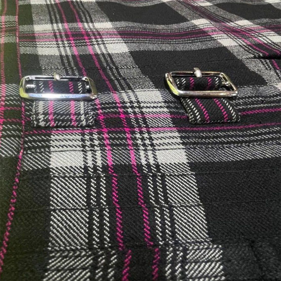 Each tartan kilt has 3 buckles and straps for size adjustment: genuine leather waist straps (4" long by 1 1/4" wide). Kilt straps on this kilt are set with an allowance of 2" looser. This kilt's front edge has fringe and is pleated to the sett but can be pleated to stripe by request. There are two belt loops at the back. The kilt has a 100% cotton lining for a soft feel when being worn. The standard kilt comes with a 5-yard, but you can convert it into an 8-yard by selecting the "8-yard kilt" option.