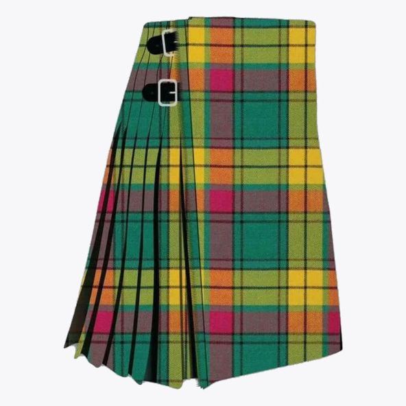 Each tartan kilt has 3 buckles and straps for size adjustment: genuine leather waist straps (4" long by 1 1/4" wide). Kilt straps on this kilt are set with an allowance of 2" looser. This kilt's front edge has fringe and is pleated to the sett but can be pleated to stripe by request. There are two belt loops at the back. The kilt has a 100% cotton lining for a soft feel when being worn. The standard kilt comes with a 5-yard, but you can convert it into an 8-yard by selecting the "8-yard kilt" option.