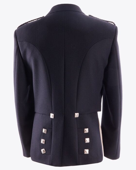 The jacket is made from premium-quality blue barathea wool and features braided epaulettes, satin lapels and square silver jacket buttons.