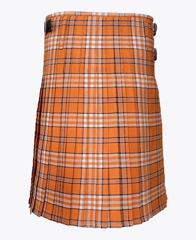 Each tartan kilt has 3 buckles and straps for size adjustment: genuine leather waist straps (4" long by 1 1/4" wide). Kilt straps on this kilt are set with an allowance of 2" looser. This kilt's front edge has fringe and is pleated to the sett but can be pleated to stripe by request. There are two belt loops at the back. The kilt has a 100% cotton lining for a soft feel when being worn. The standard kilt comes with a 5-yard, but you can convert it into an 8-yard by selecting the "8-yard kilt" option.